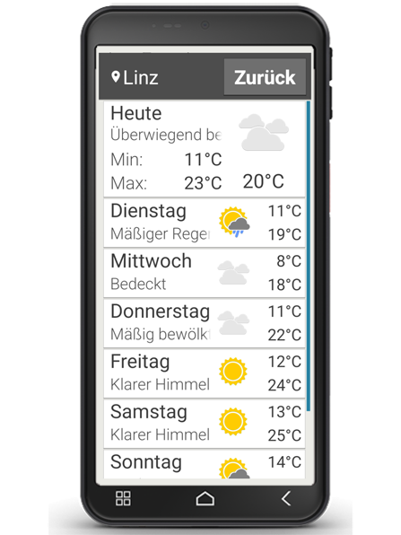One of the most popular features of smartphones is their ability to provide information on the current weather and the weather forecast. The emporia Weather app is simple with a clear layout and also shows the current temperature on the home screen.