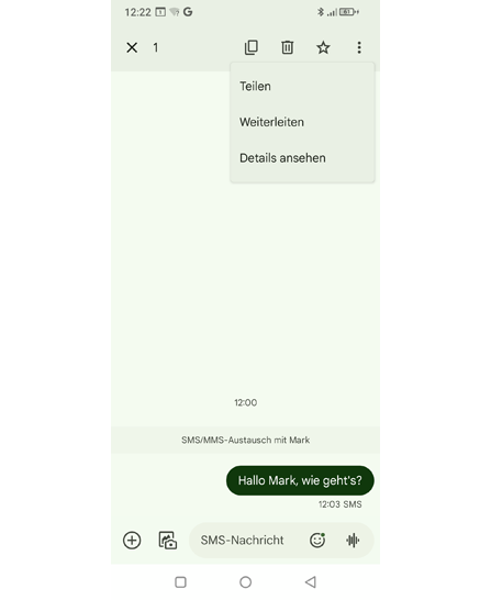 • Der Text wird in eine neue SMS-Nachricht kopiert.